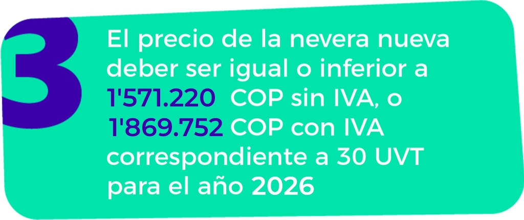 Ahora puedes acceder a este beneficio gracias al Decreto 2143 de 2017, sustituyendo tu nevera vieja por una nueva. Aplica para todas las marcas de neveras viejas de uso doméstico para refrigeración y/o congelación de alimentos.
